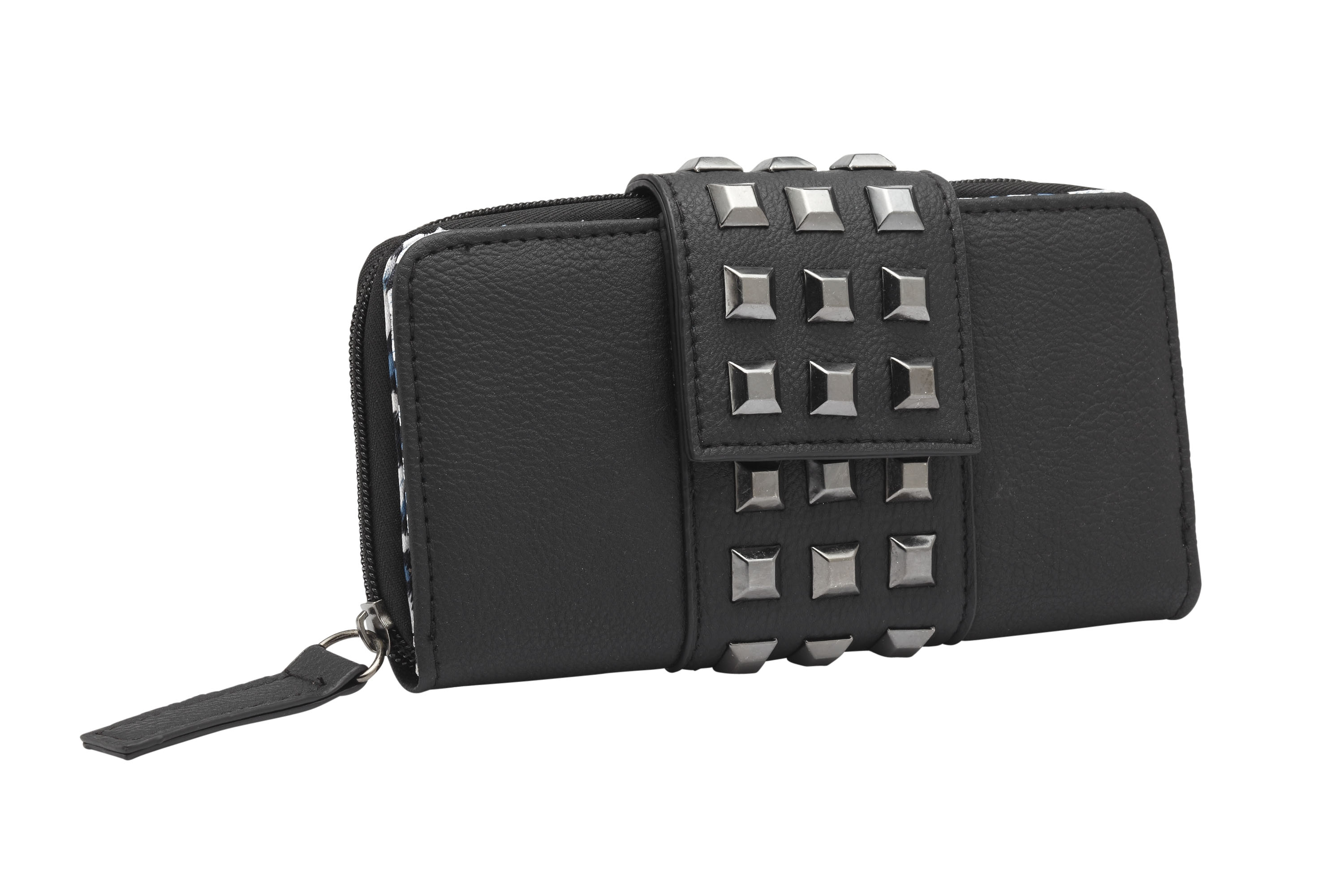 The Avery wallet matches its Rock Rebel bag perfectly or adds to your rocker style. Folded rounded body with a canvas square gun metal studded magnetic strap and a blue leopard print interior. Has clear ID holder, multiple card slots, zip change pocket and bill pocket.